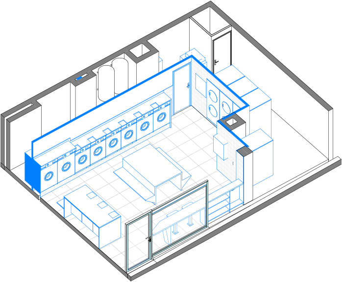 La rénovation de cette laverie à commencé par l’étude de l’histoire et des usages de ces espaces collectifs afin de proposer plusieurs configurations pertinentes. La solution retenue par la cliente s’organise autour de plusieurs îlots qui structurent le volume et facilitent les déplacements. Les fonctions se répartissent entre le centre et la périphérie, avec, au cœur du dispositif, une grande table de pliage qui devient l’élément principal.