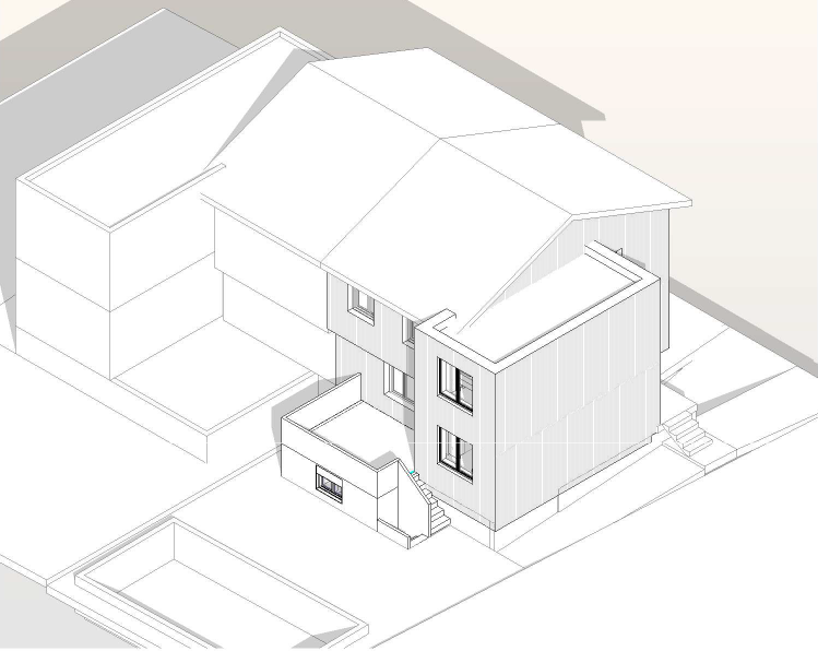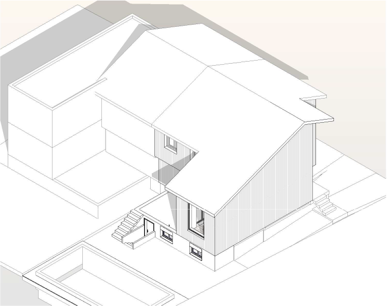 La deuxième esquisse tire parti du volume existant en proposant une extrusion vers le nord, limitant ainsi l’impact sur les espaces extérieurs et l’ensoleillement. Avec 41 m² additionnels, cette solution permet de créer deux chambres confortables, un double garage naturellement éclairé et une terrasse au sol qualitative, davantage protégée du voisinage.
