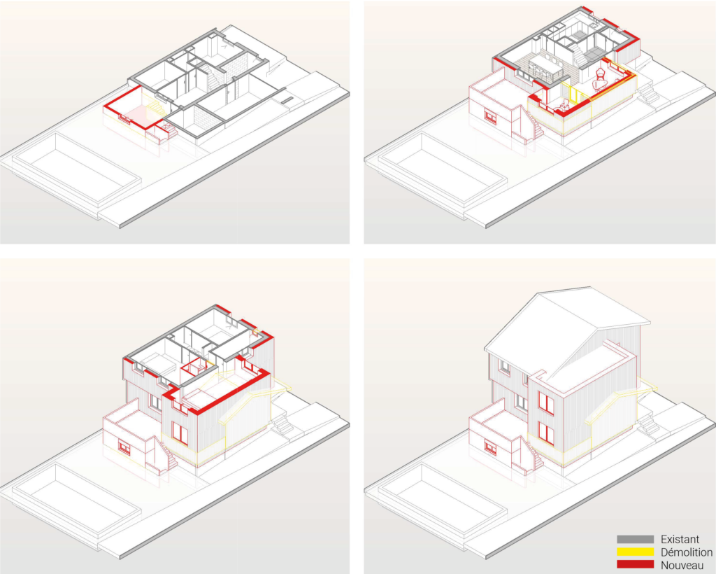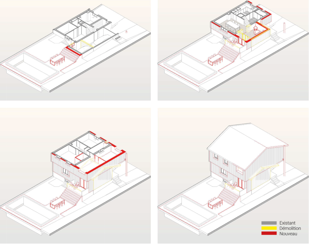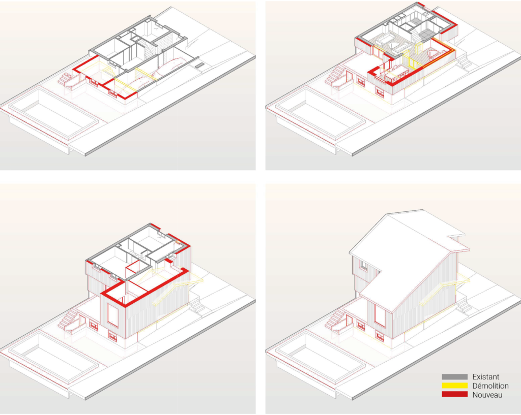 Cette solution génère un agrandissement direct du salon et crée une nouvelle chambre généreuse à l’étage, tout en augmentant la surface exploitable du sous-sol.